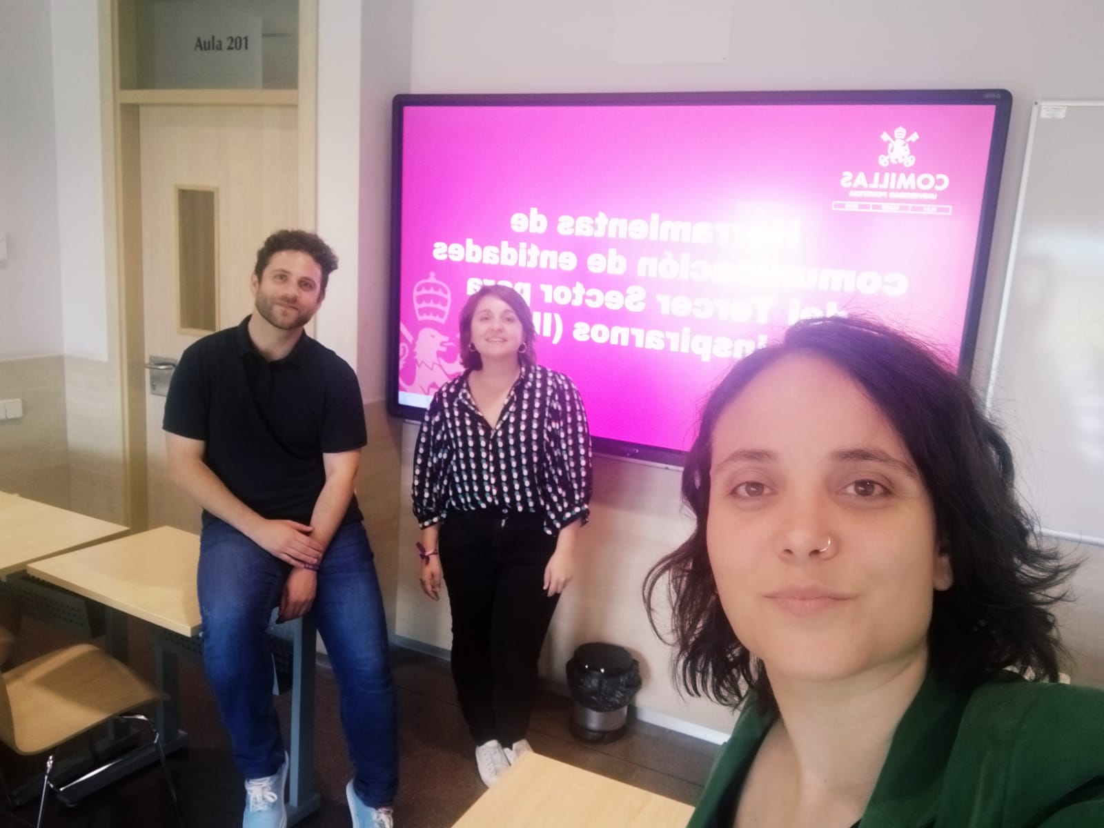 Nuestras compañeras Sandra Pintor, José Luis Izaguirre y Silvia Soto Ruiz imparten clase concretamente en Cantoblanco, el campus donde se ubica la Facultad de Ciencias Humanas y Sociales de la Universidad, a alumnado de Relaciones Internacionales, Comunicación Global y Traducción e Interpretación.
