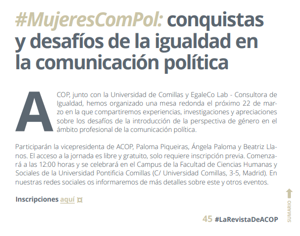 Alrededor del 8 de marzo, y con motivo del Día Internacional de las Mujeres, se celebró la jornada “#MujeresComPol: conquistas y desafíos de la #igualdad en la comunicación política”, organizada por EgaleCo Lab, S. Coop., ACOP – Asociación de Comunicación Política y la Universidad Pontificia Comillas ICAI-ICADE.